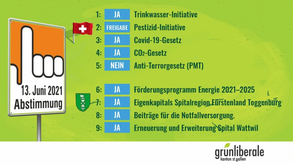 Die Mitglieder und der Vorstand der Grünliberalen Kanton St.Gallen fassten an ihren virtuellen Versammlungen die Parolen zu den nationalen und kantonalen Abstimmungsvorlagen vom 13. Juni 2021.