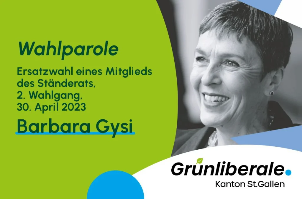 DieGrünliberaleni Kanton St.Gallen empfehlen im zweiten Ständeratsersatzwahlgang vom 30. April 2023 Barbara Gysi (SP) zur Wahl.