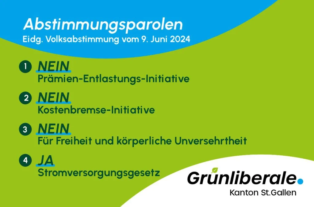 Die Mitglieder der Grünliberalen Kanton St.Gallen sagen einstimmig Ja zum Stromversorgungsgesetz. Die Volksinitiativen zur Krankenkassenprämien-Verbilligung, zur Kostenbremse und die Initiative «Für Freiheit und körperliche Unversehrtheit» lehnen sie klar ab.