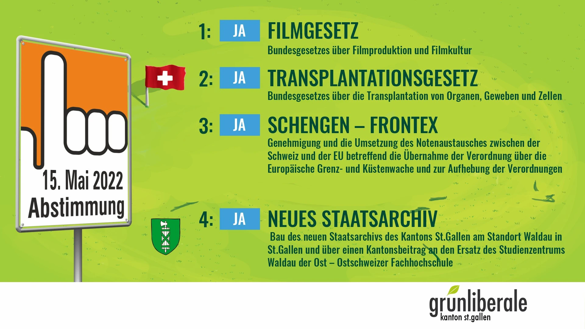 Die Grünliberalen haben anlässlich ihrer ordentlichen Mitgliederversammlung vom 26. April im Waaghaussaal St.Gallen die Parolen für die kommenden Abstimmungen gefasst. Sie sagen klar Ja zur kantonalen Vorlage, wie auch zu den drei eidgenössischen Vorlagen, über die am 15. Mai abgestimmt wird.