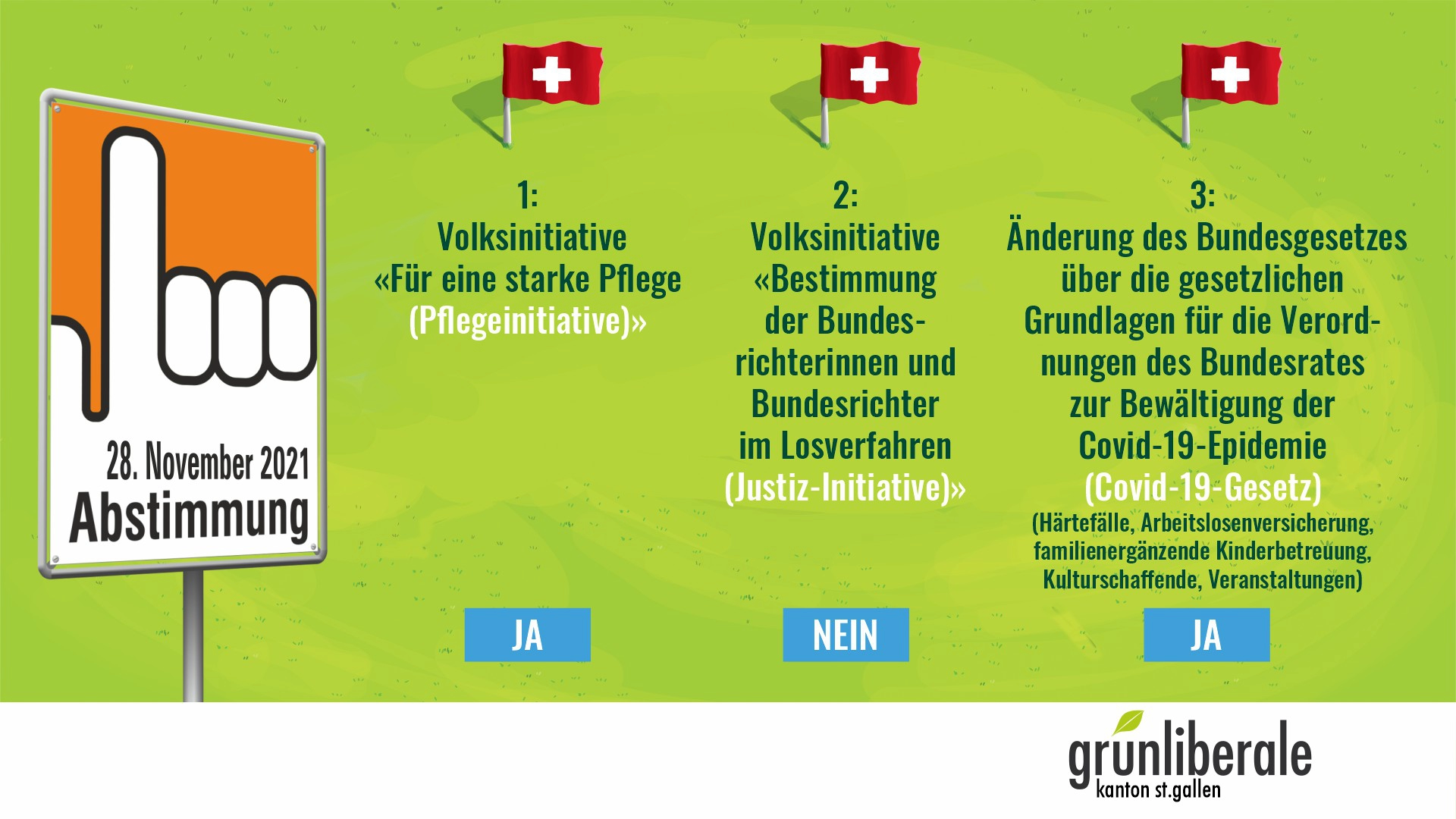 Diskussion zu den eidgenössischen Vorlagen gab es einzig bei der Pflegeinitiative. Doch auch hier waren sich die Grünliberalen inhaltlich einig: Eine Minderheit befand lediglich, dass arbeitsrechtliche Regelungen nicht in die Verfassung gehörten und der indirekte Gegenvorschlag des Parlaments schneller zur Erreichung der gewünschten Ziele führen würde. Schliesslich stimmte die überwiegende Mehrheit für die Initiative. Im Gegensatz zur Initiative versäumt es der Gegenvorschlag, die Grundproblematik anzugehen. Er sieht keine Massnahmen zur Erhöhung der Berufsverweildauer und der Sicherung der Pflegequalität vor.