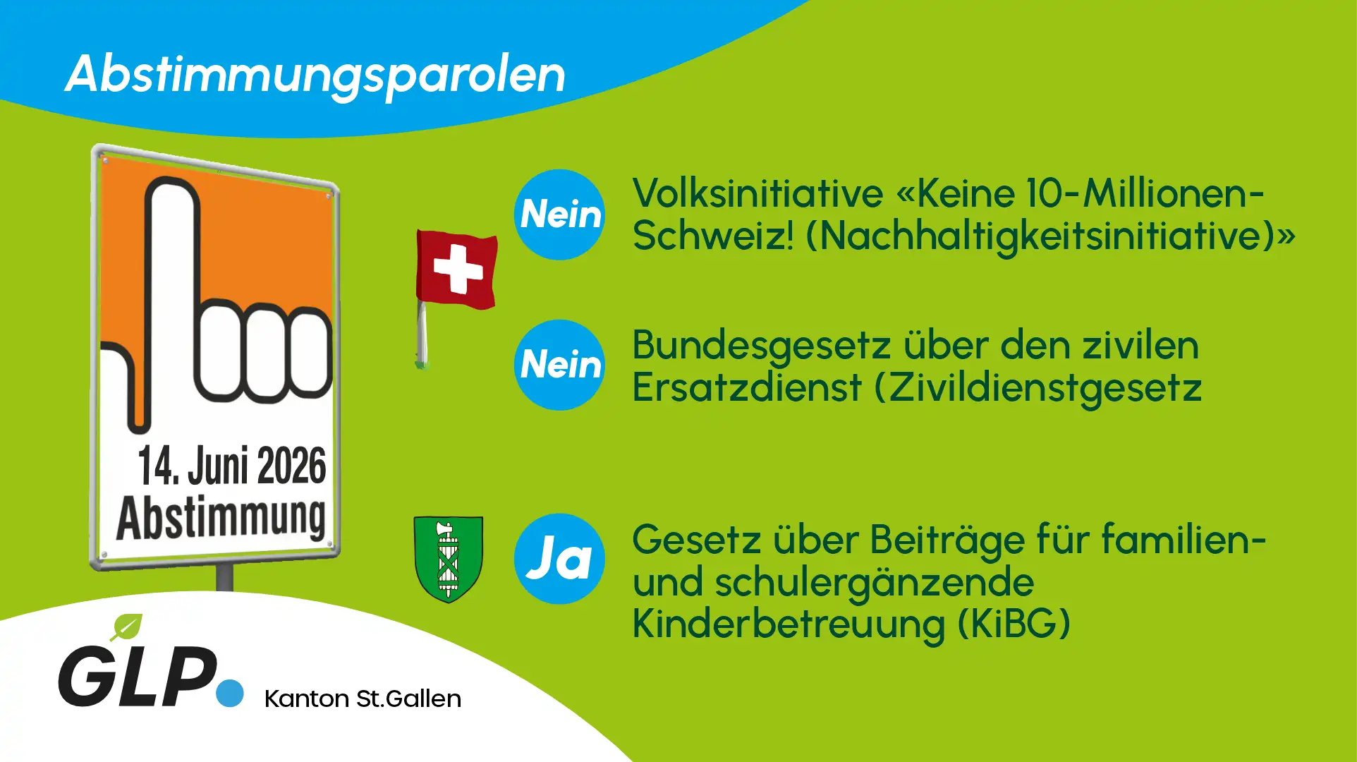 Die GLP St.Gallen lehnt die sogenannte «Nachhaltigkeitsinitiative, keine 10-Millionen-Schweiz» einstimmig ab. Aus Sicht der Grünliberalen ist der Titel der Vorlage irreführend. Nachhaltig wäre nicht die Initiative, sondern der Schaden, den sie für Wirtschaft, Arbeitsmarkt und den bilateralen Weg verursachen würde. Die Vorlage zielt faktisch auf eine Kündigung der Personenfreizügigkeit ab und gefährdet damit einen zentralen Pfeiler des Schweizer Wohlstands. Die GLP setzt stattdessen auf eine sachliche und wirksame Politik, die Herausforderungen bei Migration und Integration gezielt angeht, ohne den Wirtschaftsstandort Schweiz zu schwächen.